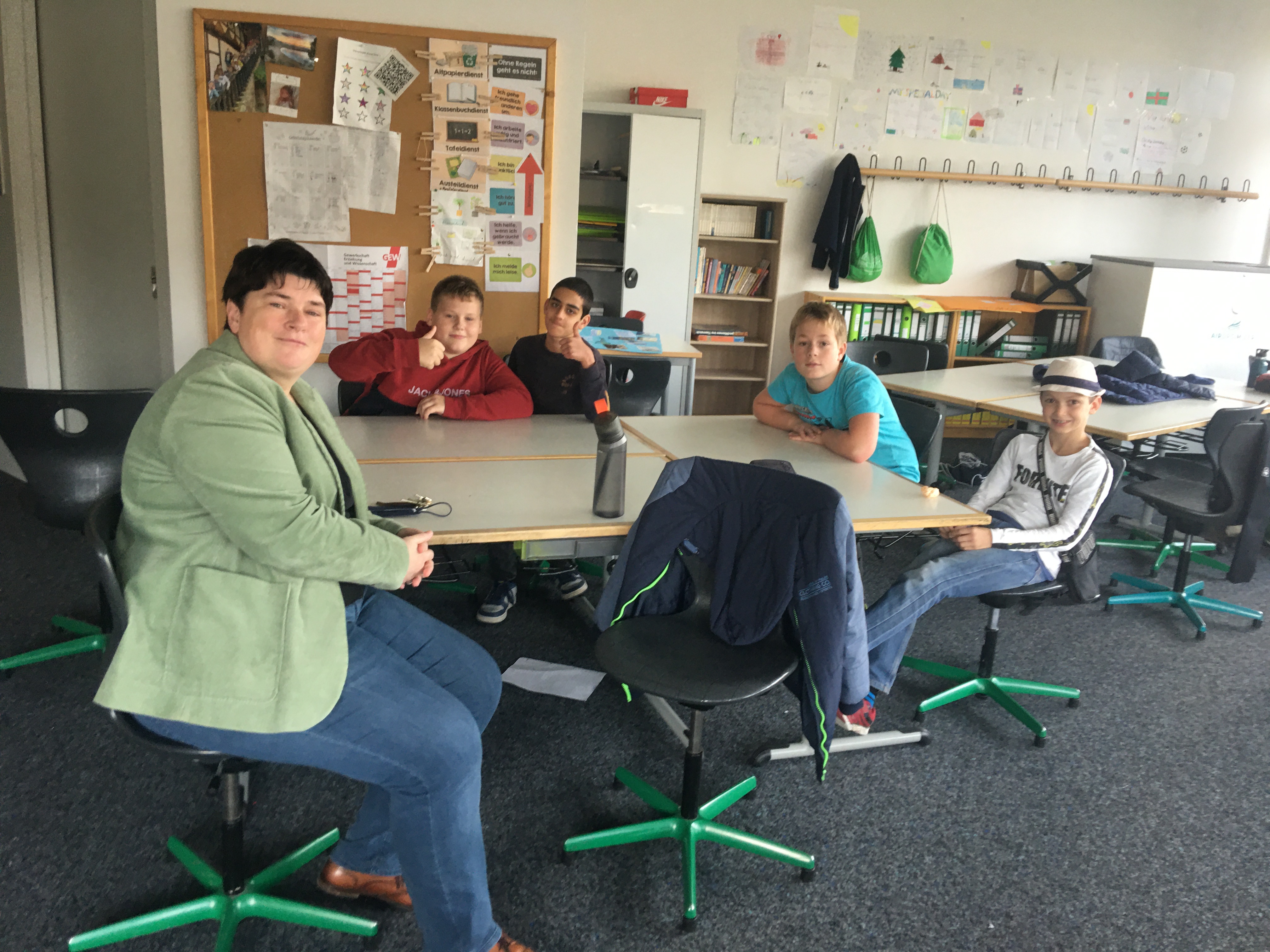 Grün5: Warum wird die umweltfeindliche Capri-Sonne noch immer an unserer Schule verkauft?  Schülerinnen und Schüler im Gespräch mit der Schulleiterin, wie man noch besser Müll trennen kann.