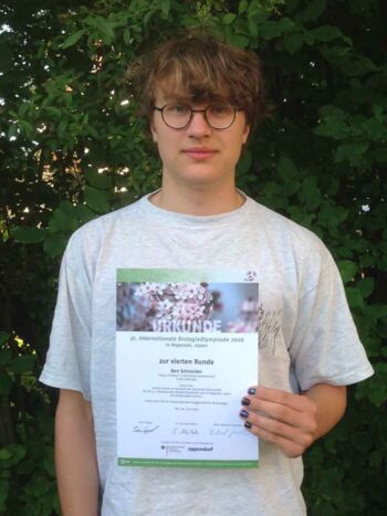 Aufgrund von Corona wurde dann aber im April die für den Sommer geplante „Biologie­olympiade“ in Nagasaki abgesagt. In Deutschland wurde sich dafür entschieden, die letzte nationale Prüfungsrunde, wenn auch unter veränderten Bedingungen, Ende Mai auszutragen. Trotz Shutdown und Verunsicherung durch Corona, Ben Schneider stellte sich der Doppelbelastung Abiturprüfung und Prüfungsvorbereitung für die letzte Qualifikations­runde. Per Videokonferenz nahm er vom 25.5. bis zum 2.6. an den Prüfungen teil. Unbeeindruckt von Corona und gerade abgelegten Abiturprüfungen erreichte Ben Schneider den 6. Platz. Eine großartige Leistung bei Prüfungen auf universitärem Niveau!